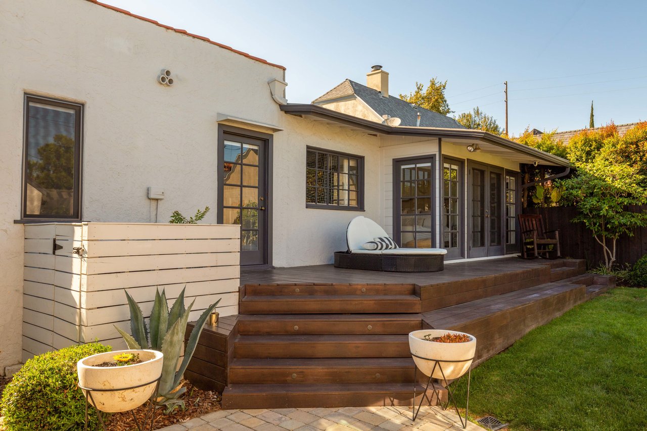 Enter into the step-down barrel-vaulted ceiling living room with a focal point fireplace, a formal dining room with custom lighting and ceiling decor, plus a redone kitchen with Italian 6-burner epicurean’s stove, stone counters, brand new Samsung Bespoke Fridge and plenty of storage, adjacent breakfast room with full built in seating with a dramatic 2-story pitched ceiling... all flooded with sunlight. Enormous primary suite with double closets, sitting area and luxe bath opens through wide French doors to a broad wood deck and grassy, professionally landscaped back garden. Rounding out the floor plan is a generous secondary bedroom with custom cabinetry, wall murals and garden views. Other features include a completely new secondary bath, along with original plaster walls, central HVAC, hardwood floors, custom lighting and tons of other wonderful elements to surprise and delight. One final and significant feature (not counted in the square footage), the converted detached garage, which offers endless possibilities with its high ceilings, crisp white paint, fully drywalled walls, Mini-split HVAC, 1/2 bath, loft and French doors opening to yard... currently providing a comfortable guest suite, and the perfect space for your ADU (check with city), home office, gym, etc. The entire property is hedged and gated, waiting for the next stewardship. Truly a home not to be missed!